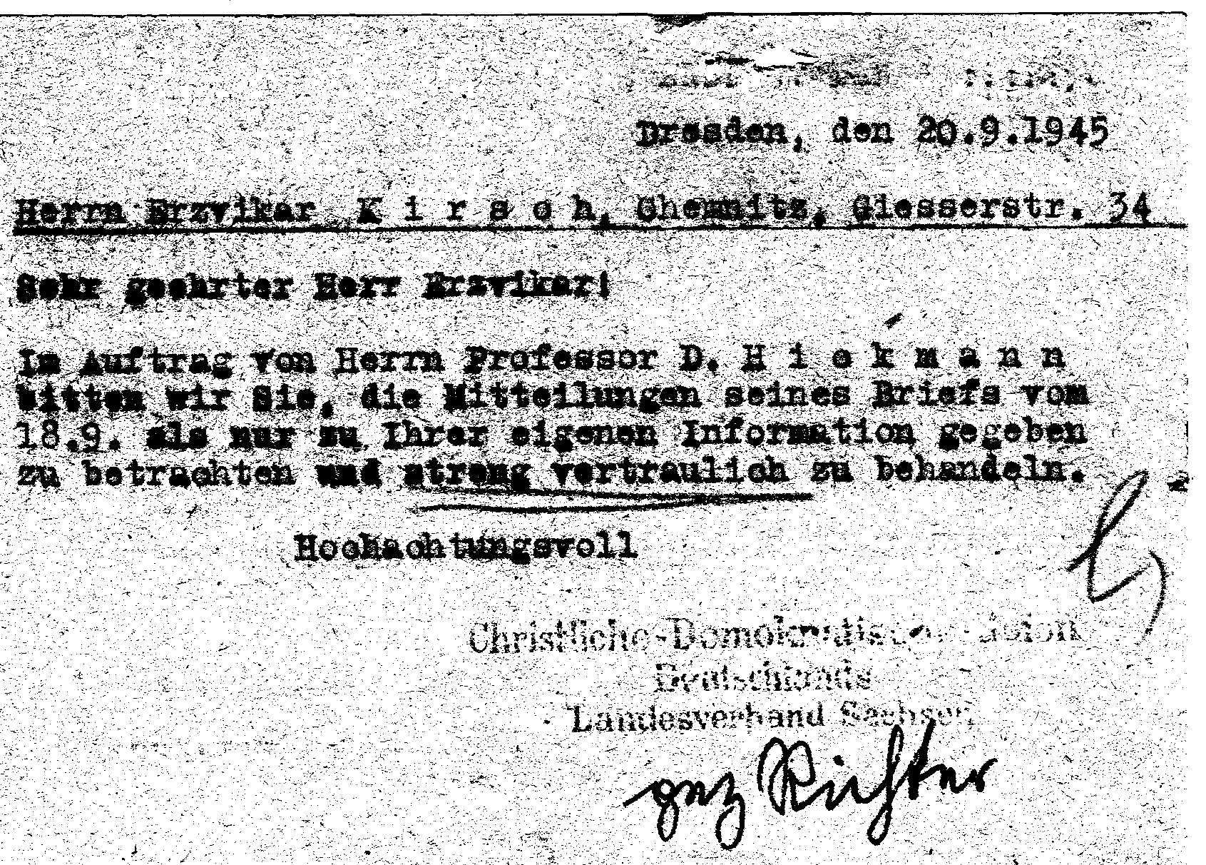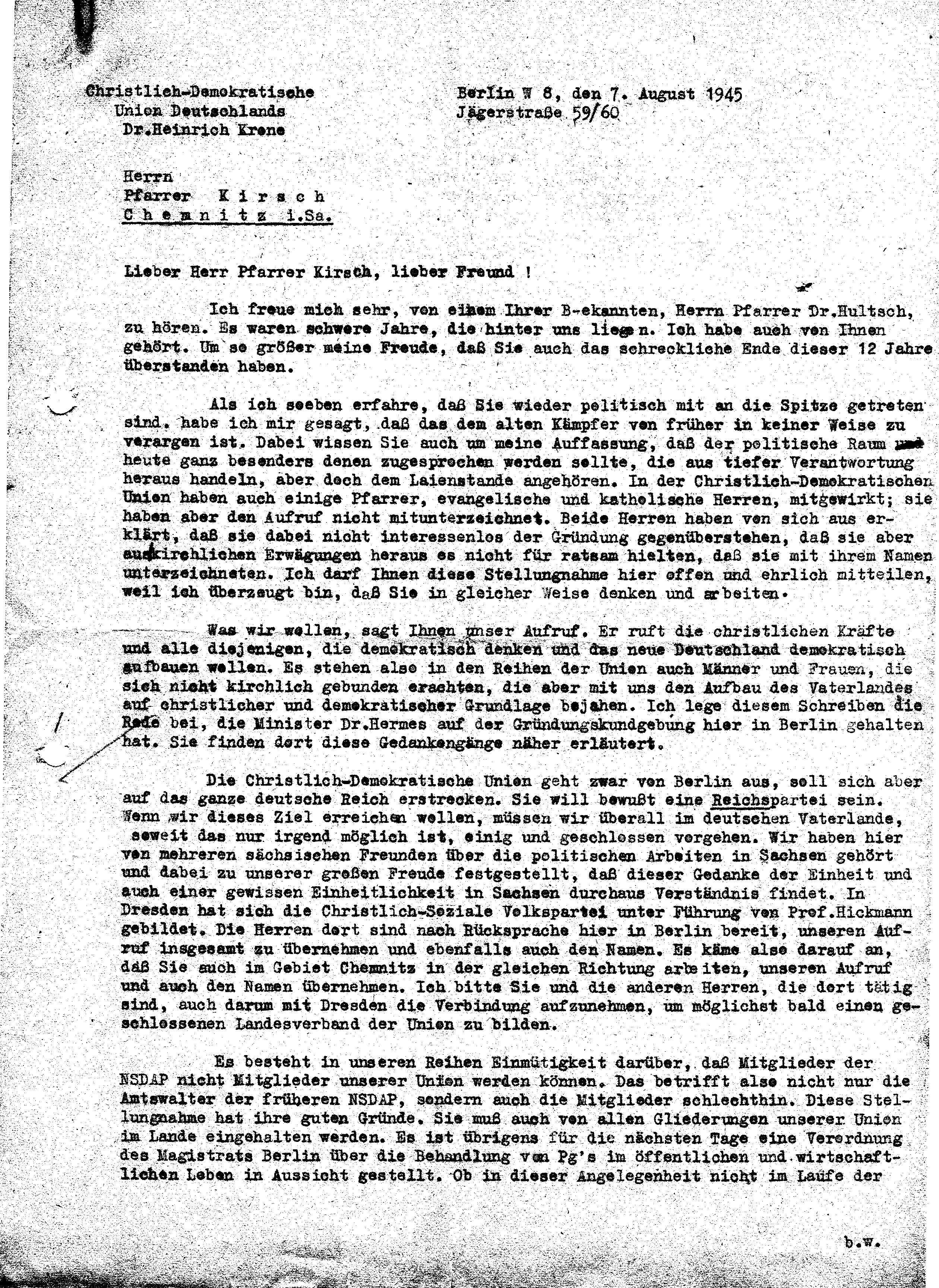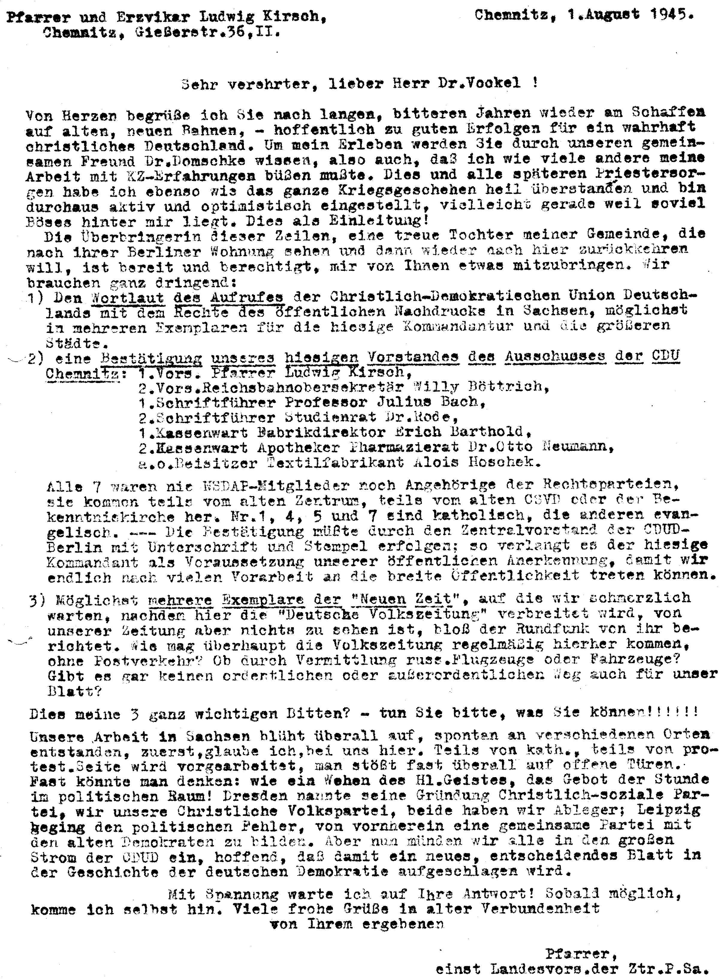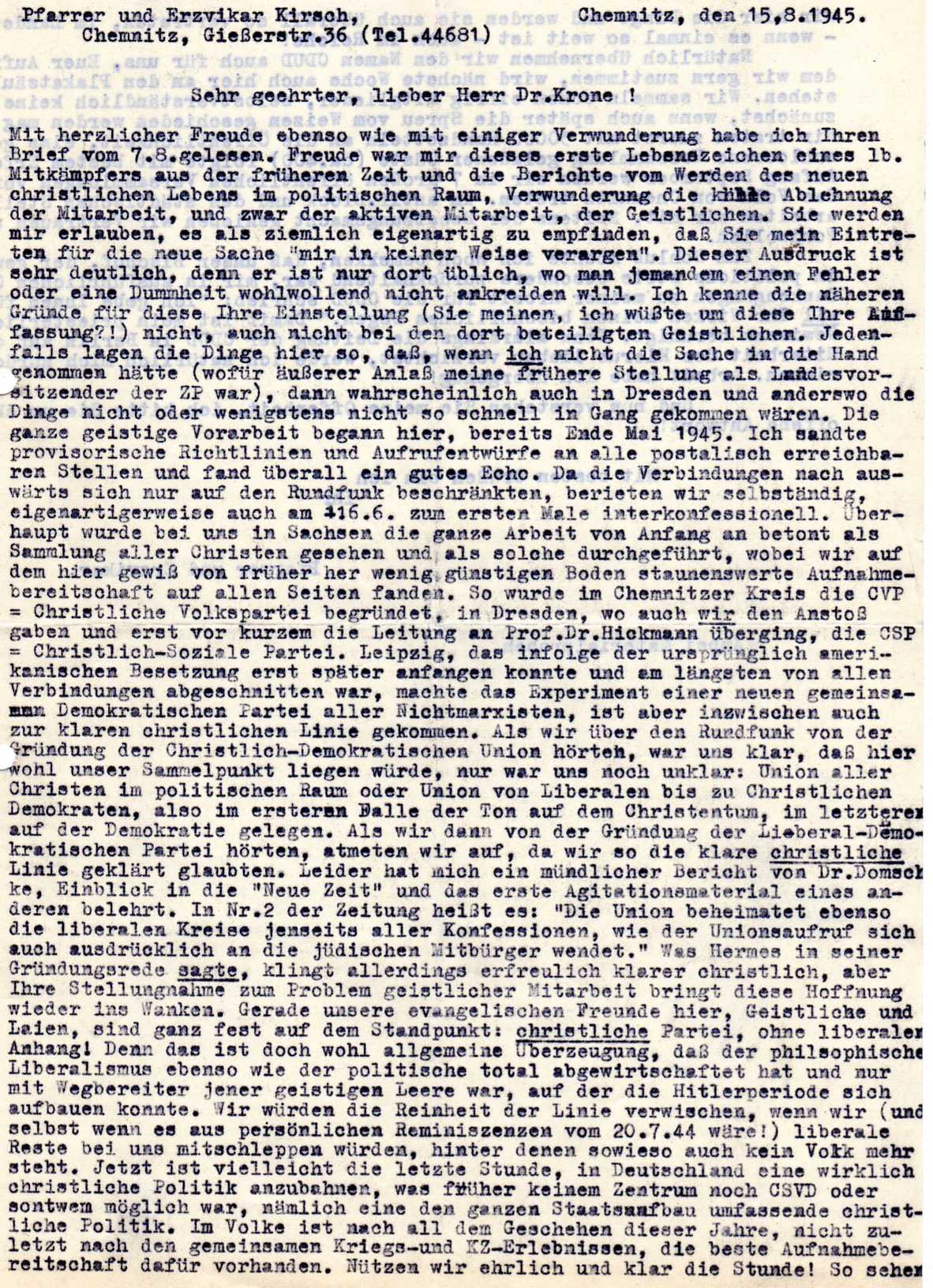 Im Gemeindearchiv der letzten Wirkungsstätte von Pfarrer Kirsch befinden sich zahlreiche Dokumente kirchlicher, privater und politischer Art. Dazu zählen Tagebücher, Predigtbücher, Zeitungskolumnen, Briefwechsel mit Personen der Zeitgeschichte, politische Arbeitsblätter, Dokumente der Seelsorge u.a.m. . Einiges davon wird an dieser Stelle vorgestellt und ergänzt. (Archivbestand St. Joseph) Hier können sie ach nachvollziehen, dass die Chemnitzer unter der Leitung von Pfarrer Kirsch die ersten Gründer einer christlichen Partei nach dem Krieg im in vier Zonen aufgeteilten Deutschland waren. Ersichtlich wird das u.a. durch den Gründungsaufruf und die Briefwechsel mit Professor Hugo Hickmann und Dr. Krone, welche die Vorreiterrolle der Chemnitzer bestätigen. Speziell dazu wird es im Gedenken an den 65. Gründungstag der CVP eine chronologischer Darstellung geben.