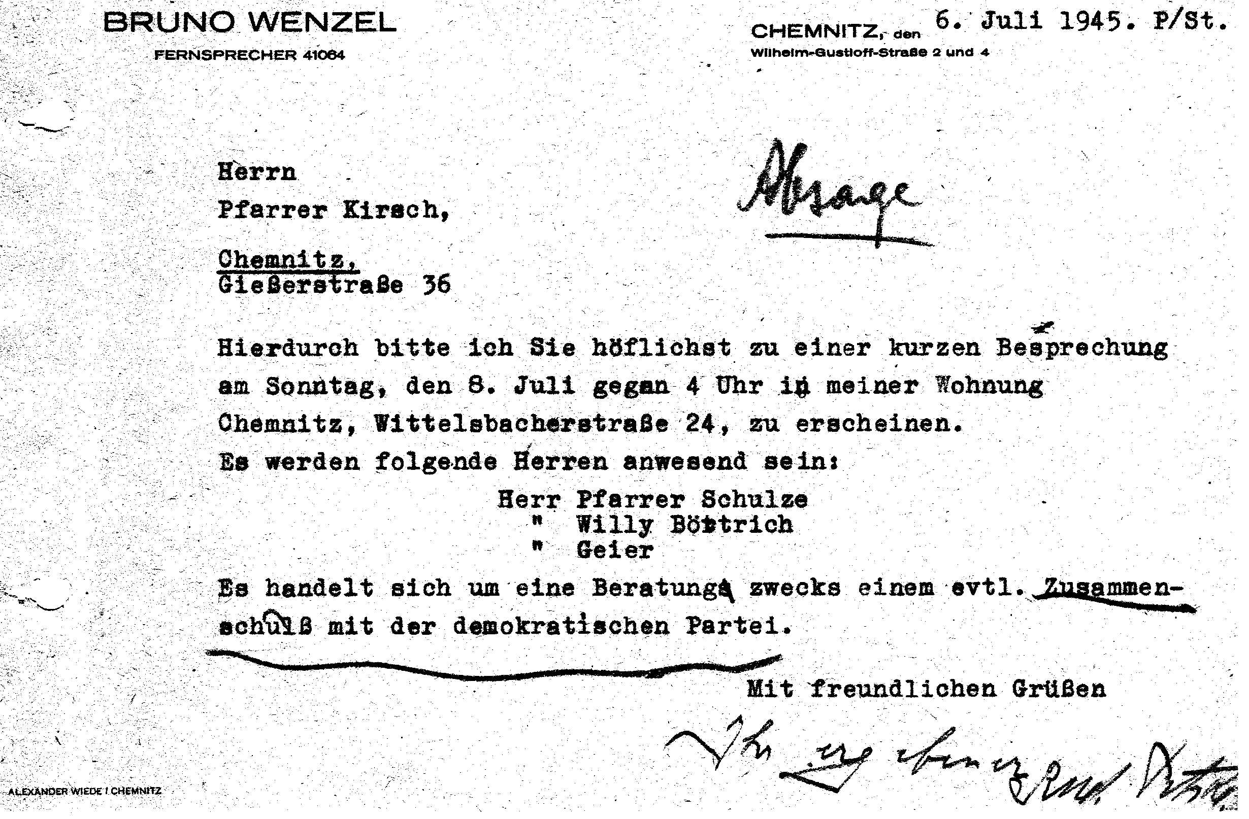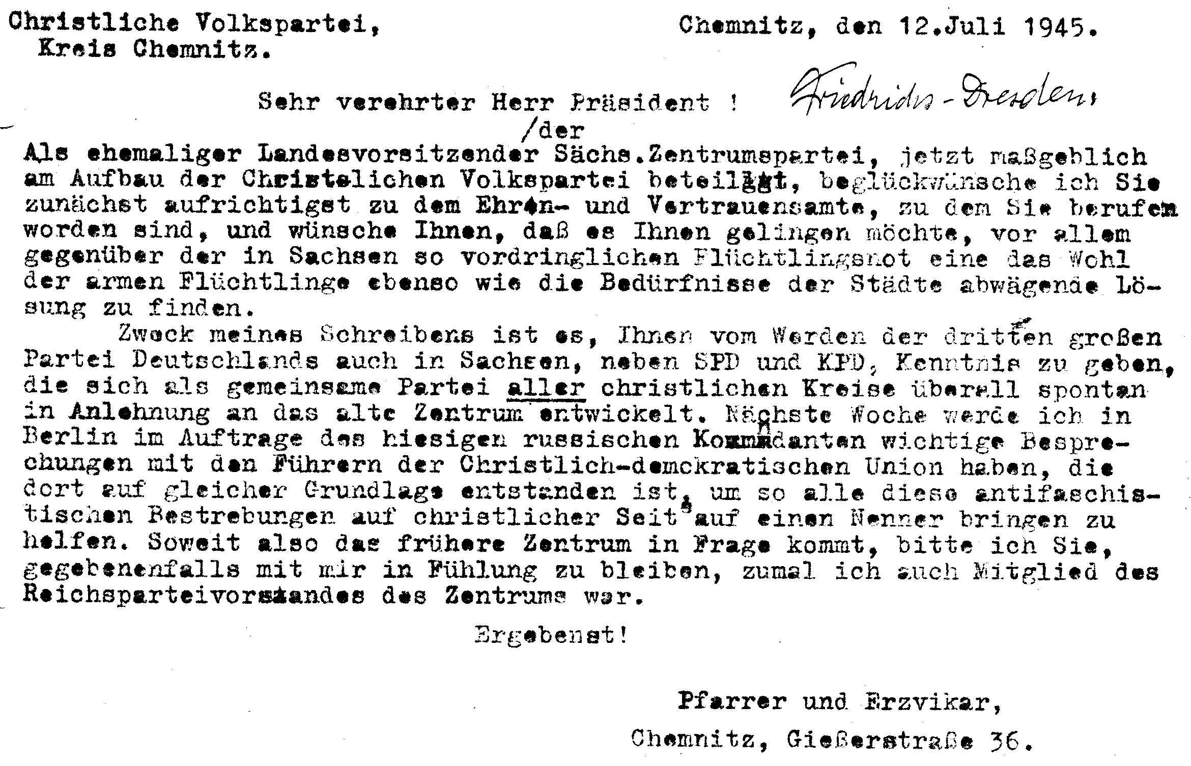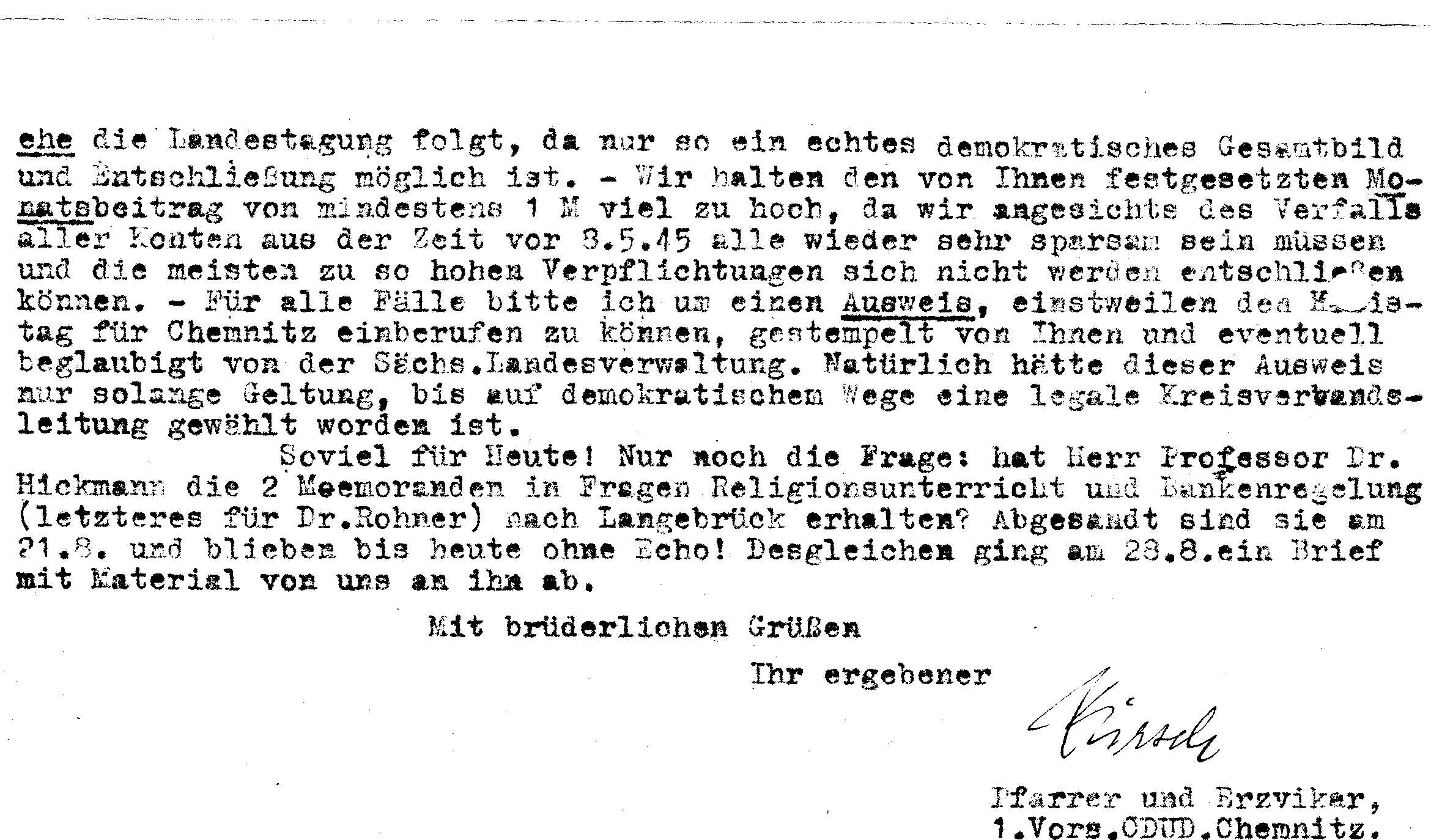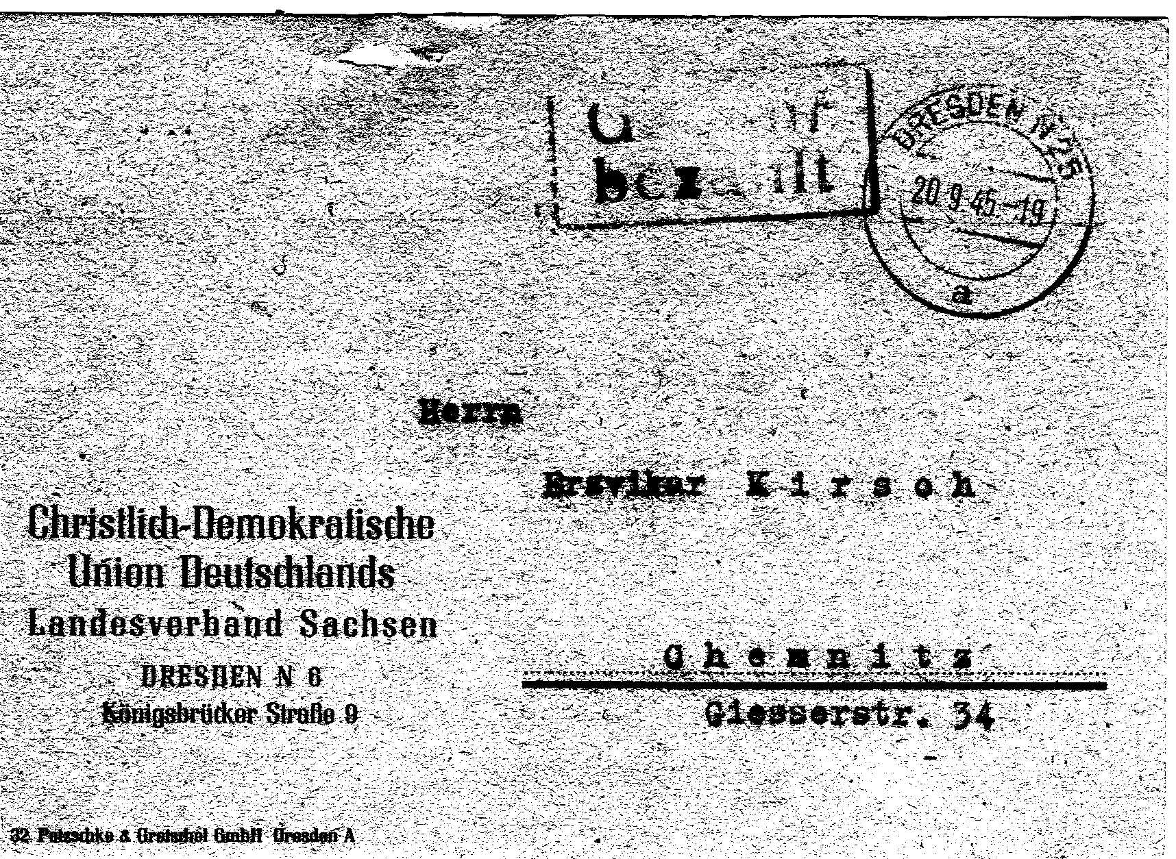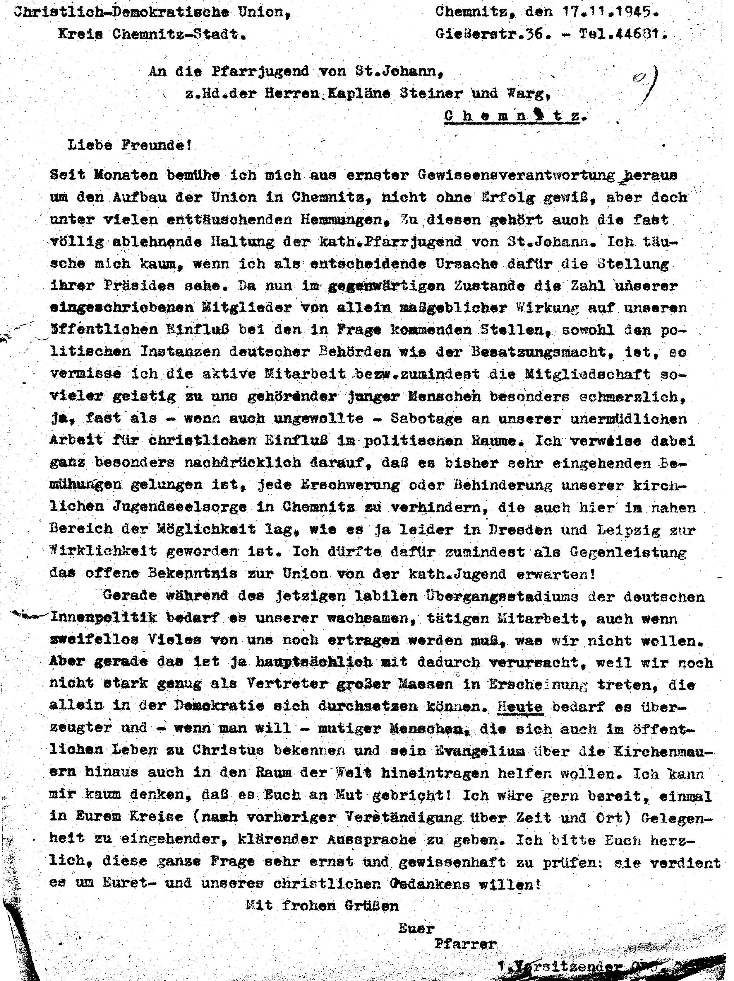 Im Gemeindearchiv der letzten Wirkungsstätte von Pfarrer Kirsch befinden sich zahlreiche Dokumente kirchlicher, privater und politischer Art. Dazu zählen Tagebücher, Predigtbücher, Zeitungskolumnen, Briefwechsel mit Personen der Zeitgeschichte, politische Arbeitsblätter, Dokumente der Seelsorge u.a.m. . Einiges davon wird an dieser Stelle vorgestellt und ergänzt. (Archivbestand St. Joseph) Hier können sie ach nachvollziehen, dass die Chemnitzer unter der Leitung von Pfarrer Kirsch die ersten Gründer einer christlichen Partei nach dem Krieg im in vier Zonen aufgeteilten Deutschland waren. Ersichtlich wird das u.a. durch den Gründungsaufruf und die Briefwechsel mit Professor Hugo Hickmann und Dr. Krone, welche die Vorreiterrolle der Chemnitzer bestätigen. Speziell dazu wird es im Gedenken an den 65. Gründungstag der CVP eine chronologischer Darstellung geben.