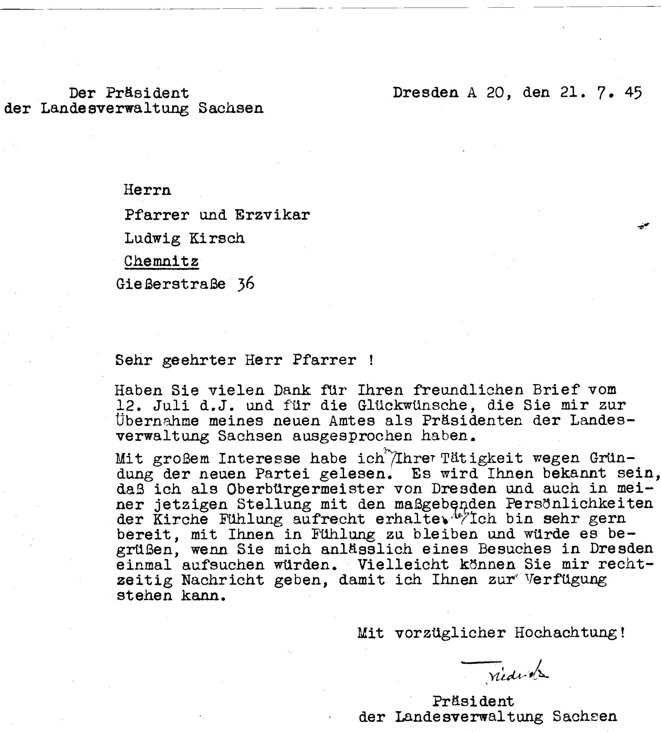 21.Juli 1945 | Präsident Friedrichs-L.Kirsch Dankschreiben | Seite 1 |