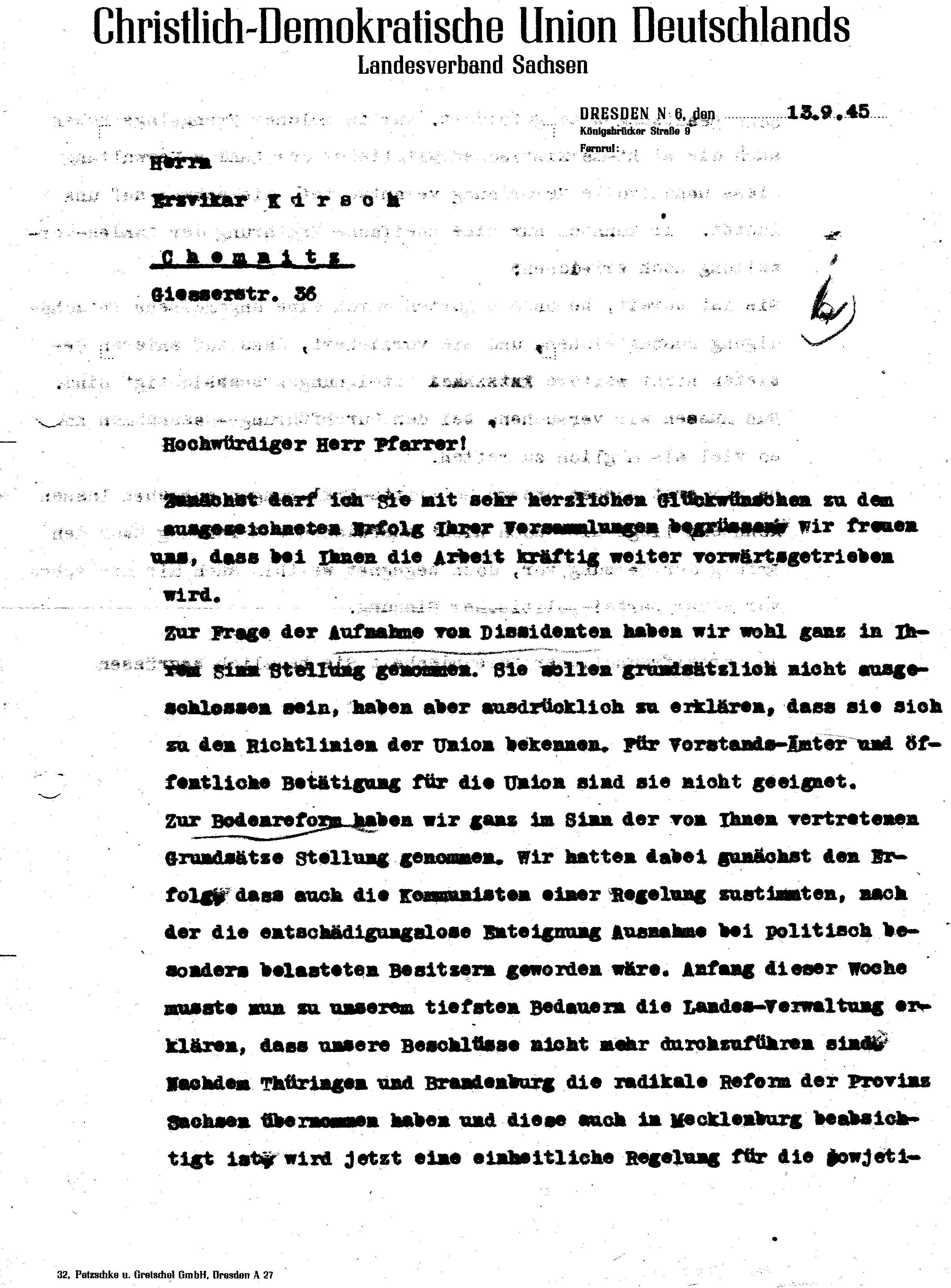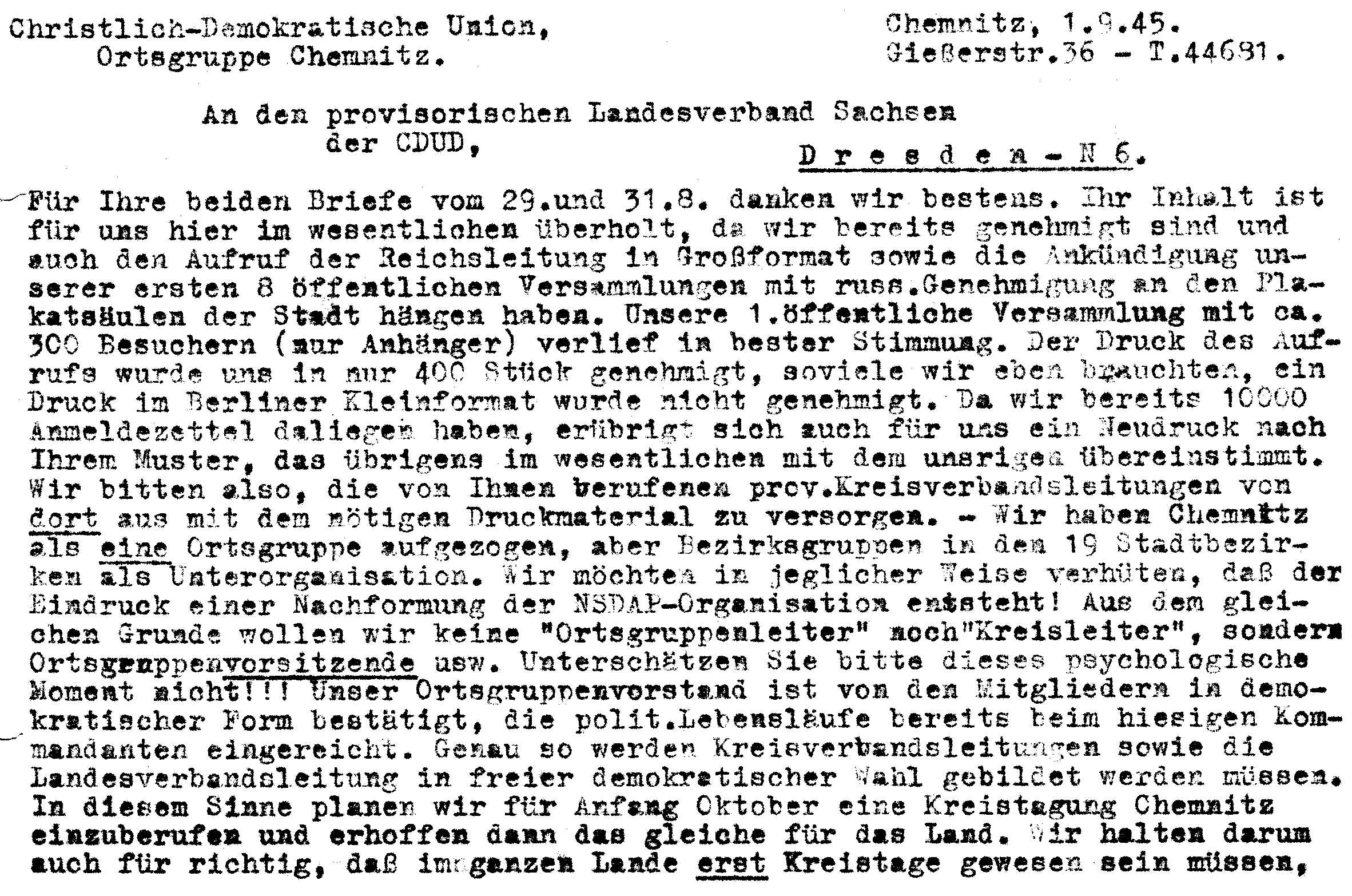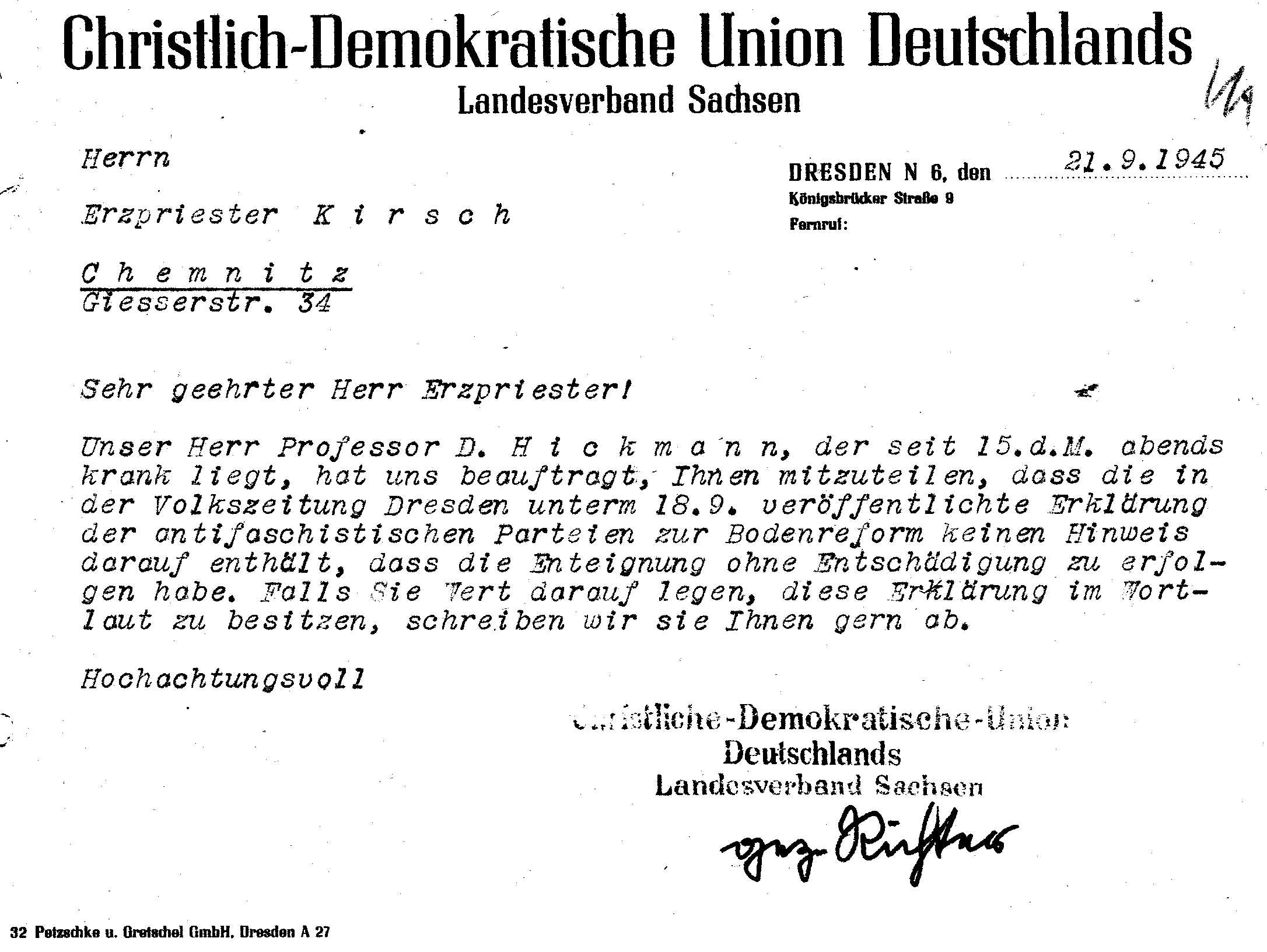 21.September 1945 | CDU Sachsen -Kirsch Hinweis Zeitungsartikel | Seite 1 |