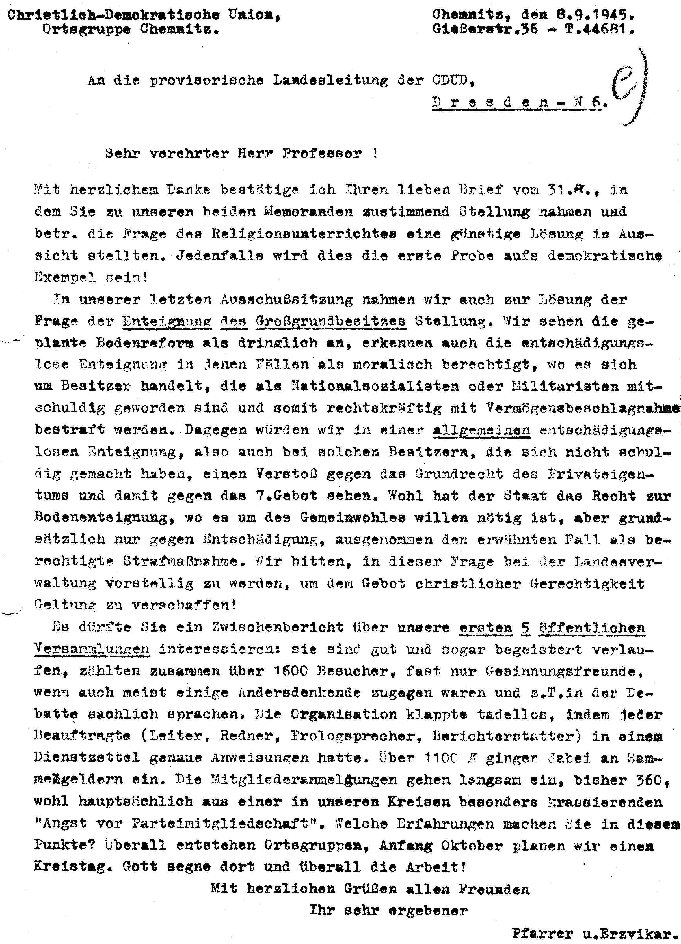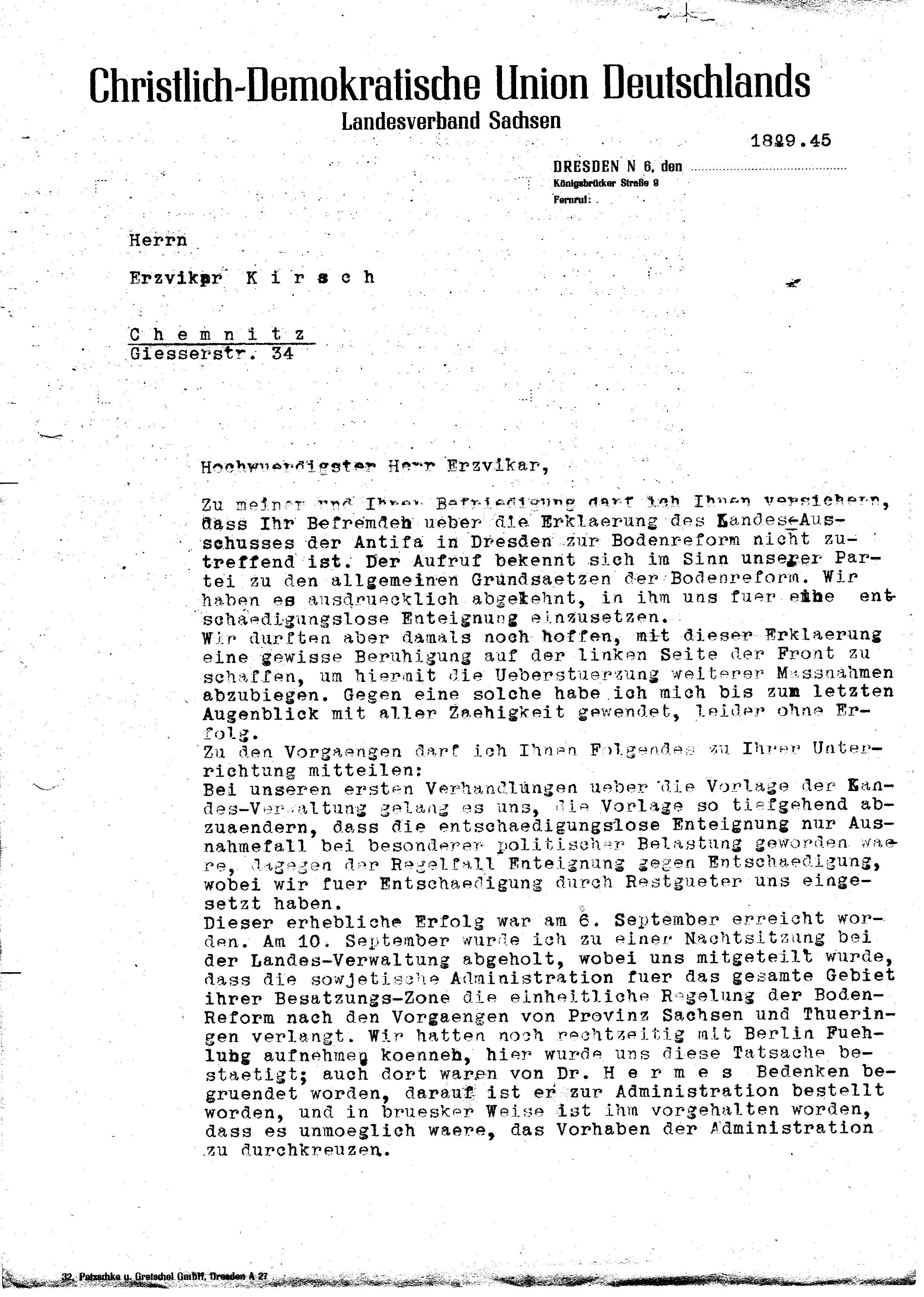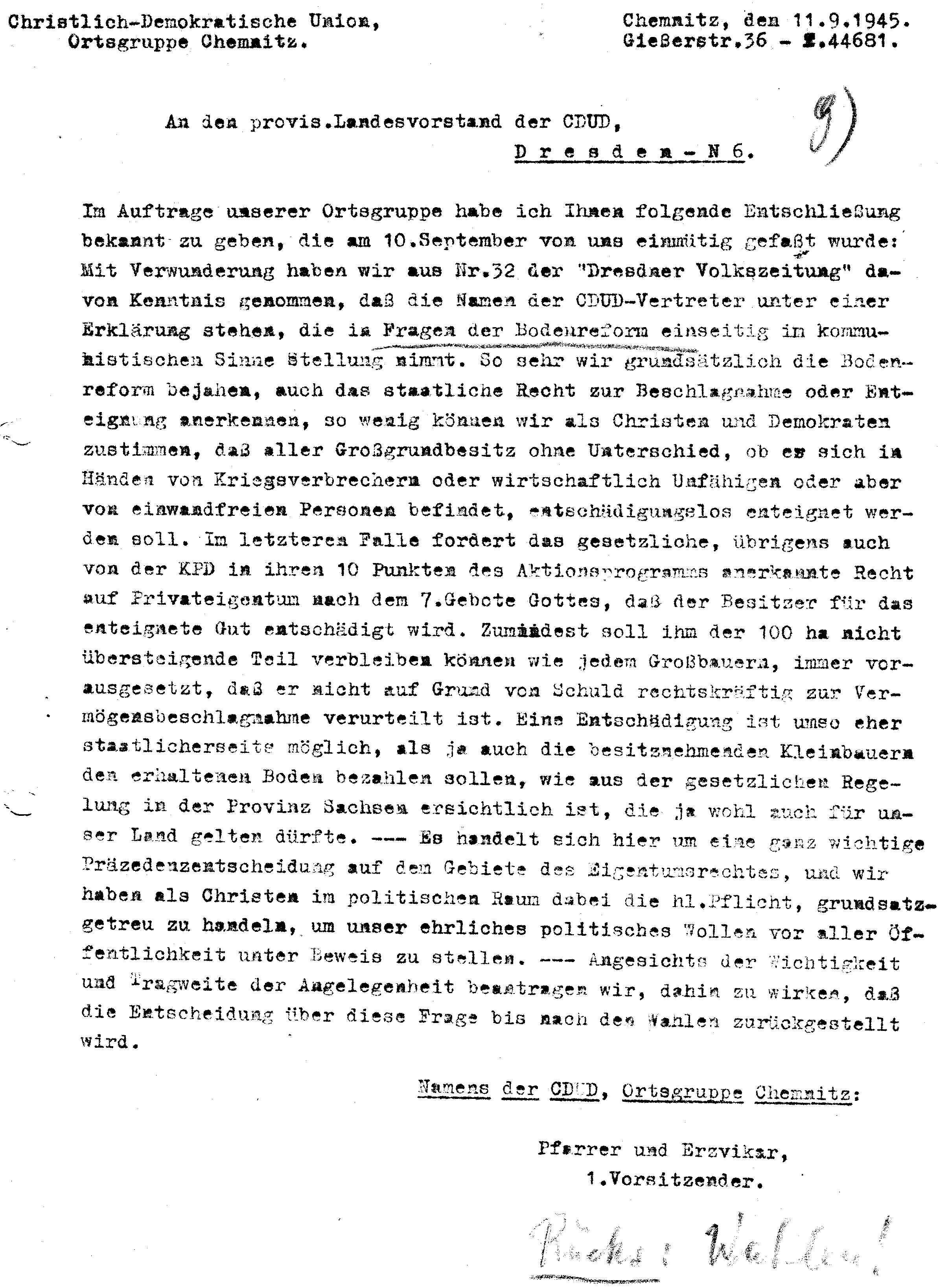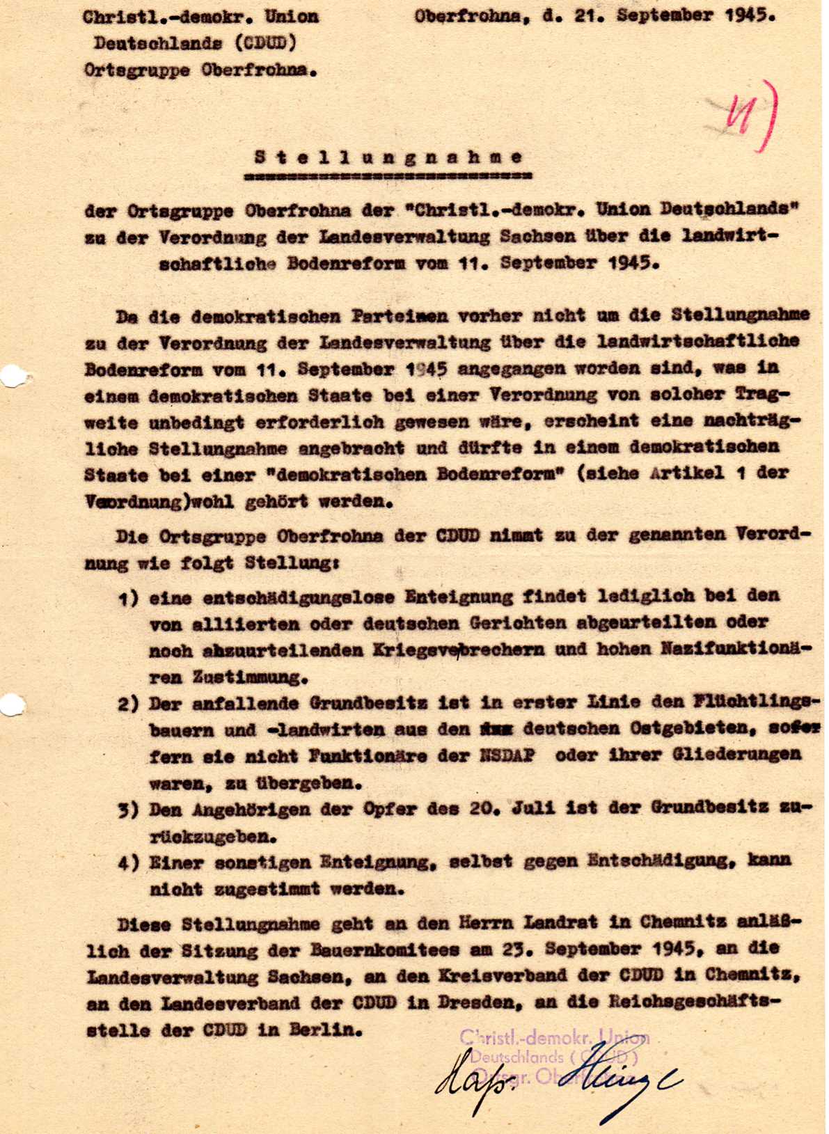21.September 1945 | CDU Limbach Stellungnahme Bodenreform | Seite 1 |