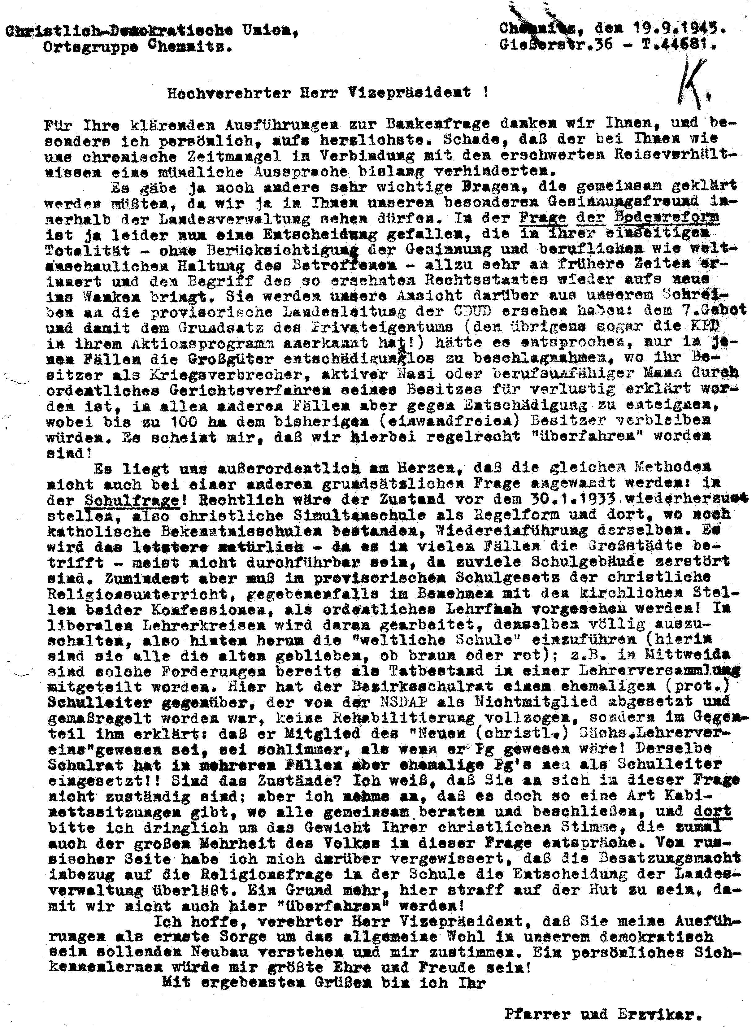 01.September 1945 | L.Kirsch-CDU-LV Sachsen Schulfrage | Seite 1 & Seite 2 |